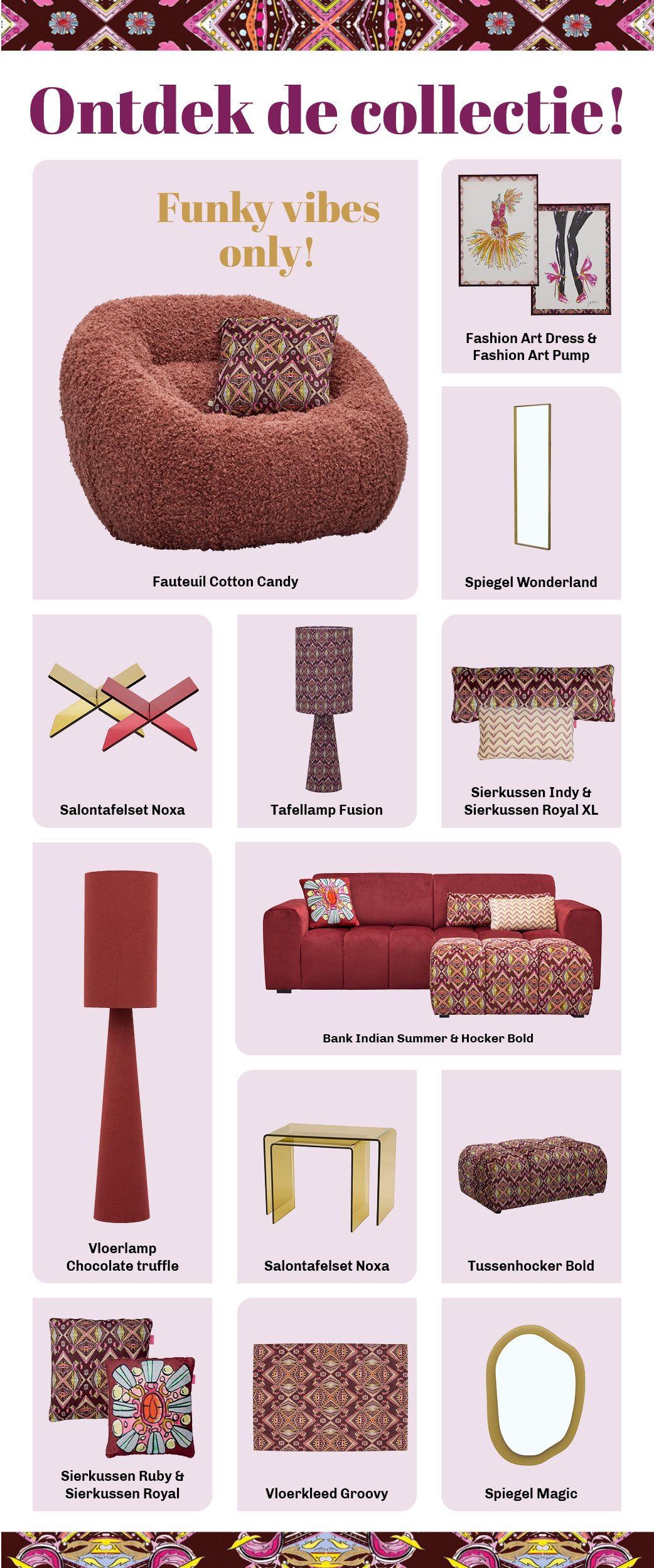 Jill is gek op diep violet, warme rozetinten, oranje accenten, ronde vormen en rijke stoffen zoals velours en gestructureerde weefsels. Alles met een vintage touch, zonder ouderwets te zijn: tijdloos, toegankelijk en altijd met een funky flow. Dit alles zie je terug in de Jill x Trendhopper collectie.